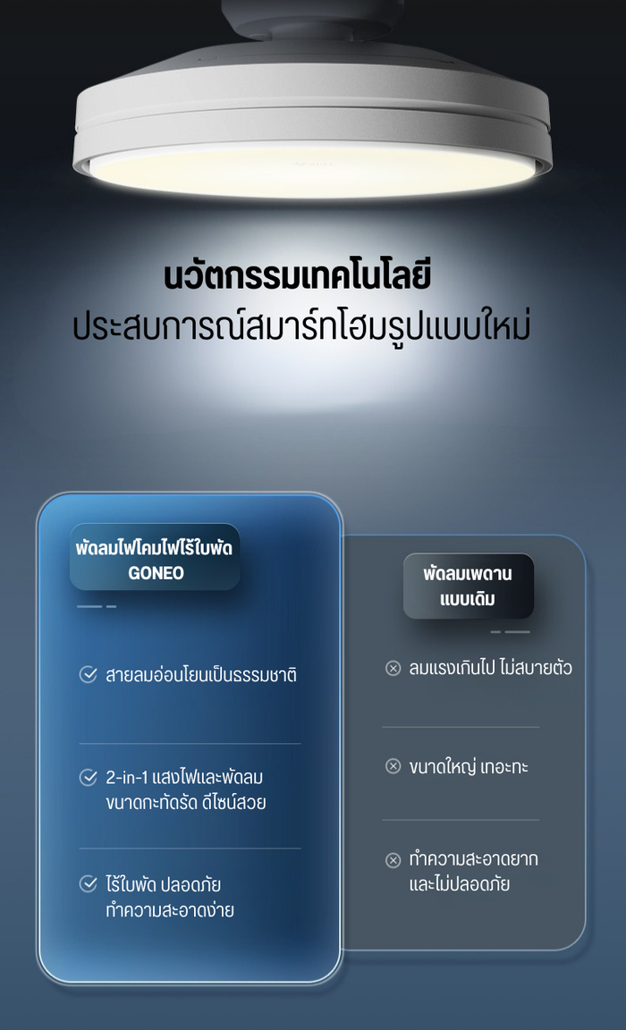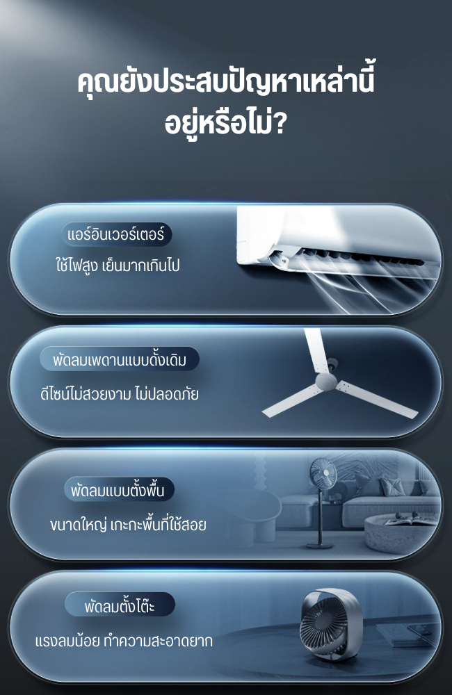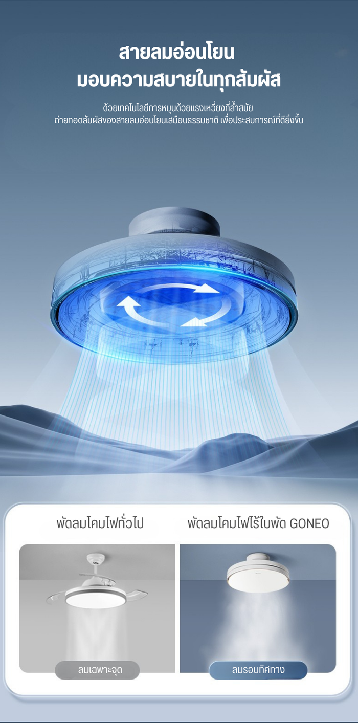 เทคโนโลยีไร้ใบพัดแบบแรงเหวี่ยงที่เป็นนวัตกรรมแรกในอุตสาหกรรม มอบการไหลเวียนของอากาศที่อ่อนโยนและนุ่มนวล ช่วยให้พื้นที่ของคุณสดชื่นและสบาย